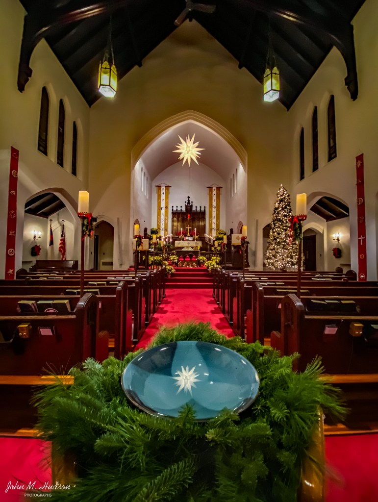 The baptismal font reflects the light of the Moravian star that hangs above the chancel. All of the candles have been lighted for the late Christmas Eve service at College Lutheran Church in Salem, Va. iPhone 11, f/2.4, 15mm, 1/30 sec., ISO 800. ©2019 John M. Hudson