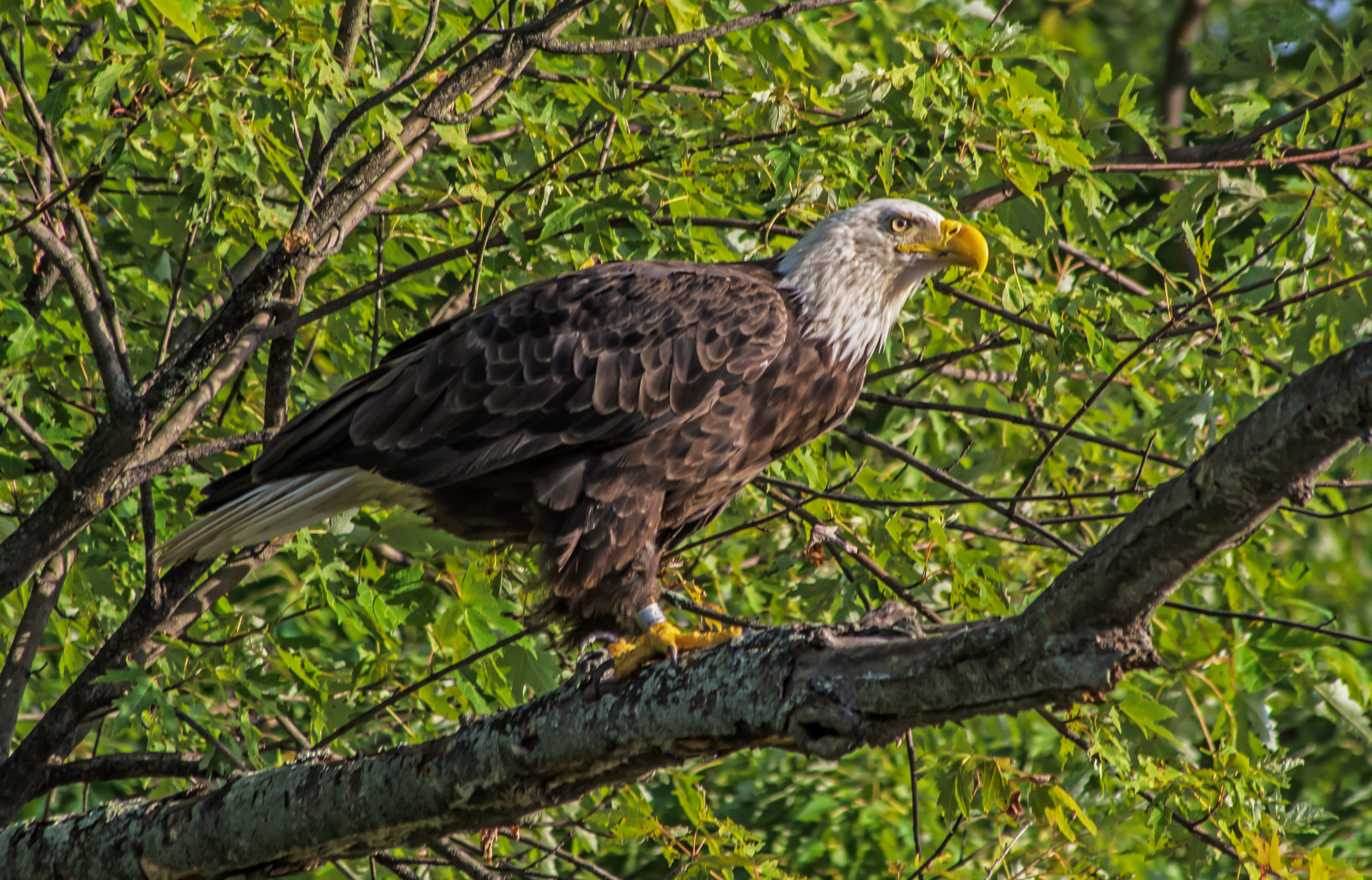 A bald eagle seeks a shady perch in the trees beside the James River south of Richmond, Va., on Sunday, Aug. 2, 2015, at 7:55 a.m. Nikon D5200. RAW. Sigma 70-300mm f/4-5.6 lens. 270mm (300mm DX). F/8. 1/400 sec. -0.3 EV. ISO 800. Click on image to enlarge.