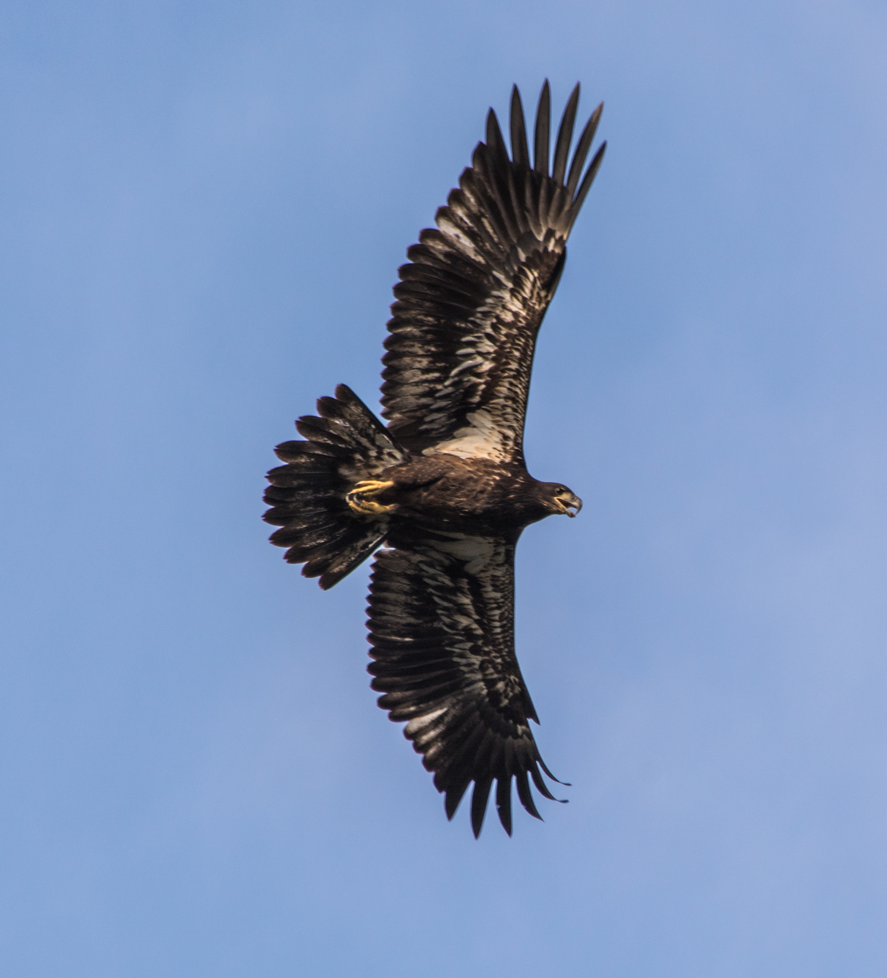 A juvenile bald eagle begins a feeding dive in the James River south of Richmond, near Deep Bottom. Taken on August 2, 2015. Nikon D5200. Sigma 70.0-300.0 mm f/4.0-5.6. f/9. 1/1500th sec. 300mm (DX450mm). ISO 360. Click on image to enlarge.