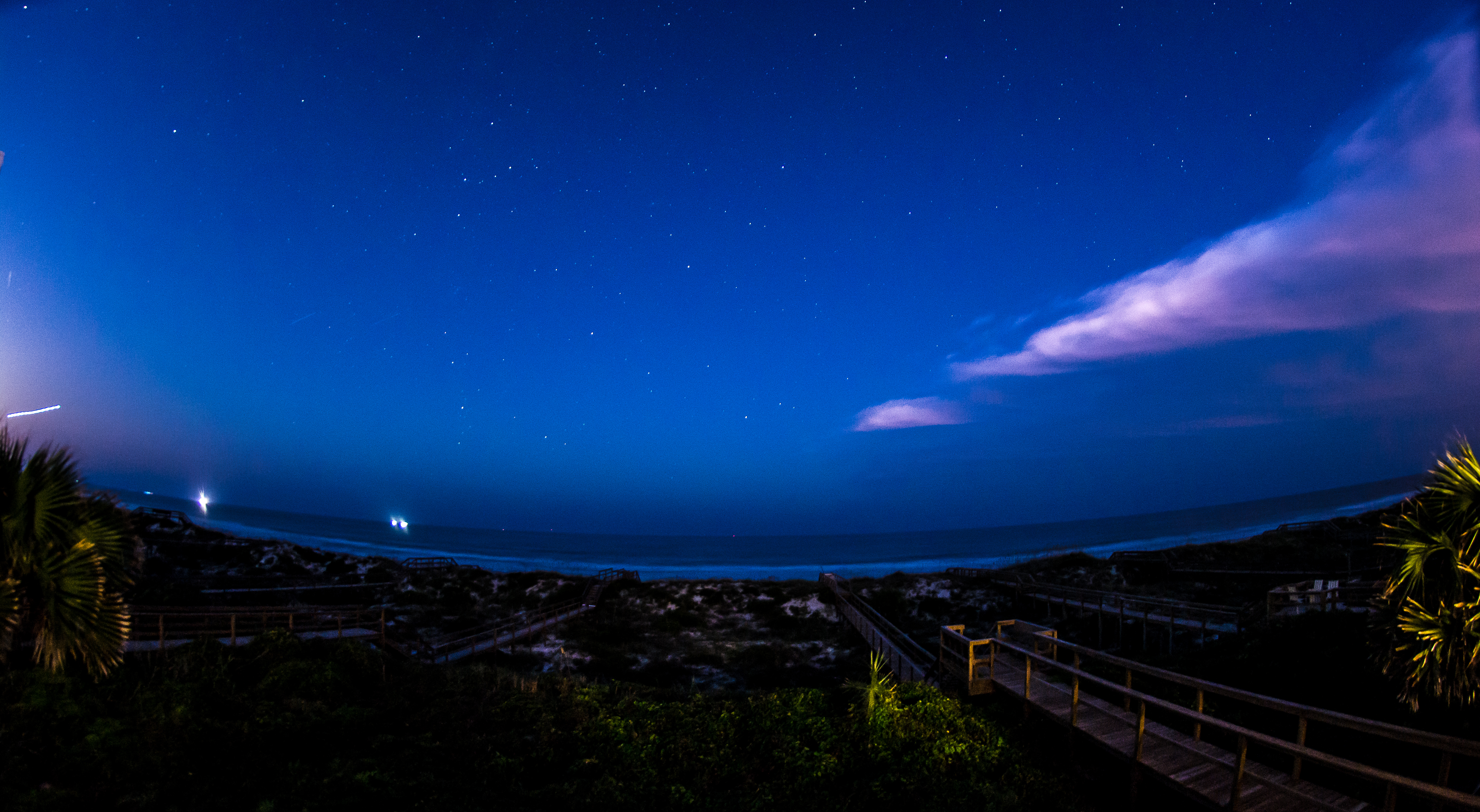 The shore at night in Crescent Beach, Fla. Taken on October 21, 2014. Nikon D5200. Rokinon 8mm f/3.5 Fisheye. f/3.5. 15 secs. 8mm (DX12mm). ISO 800. 0EV. Click on image to enlarge.