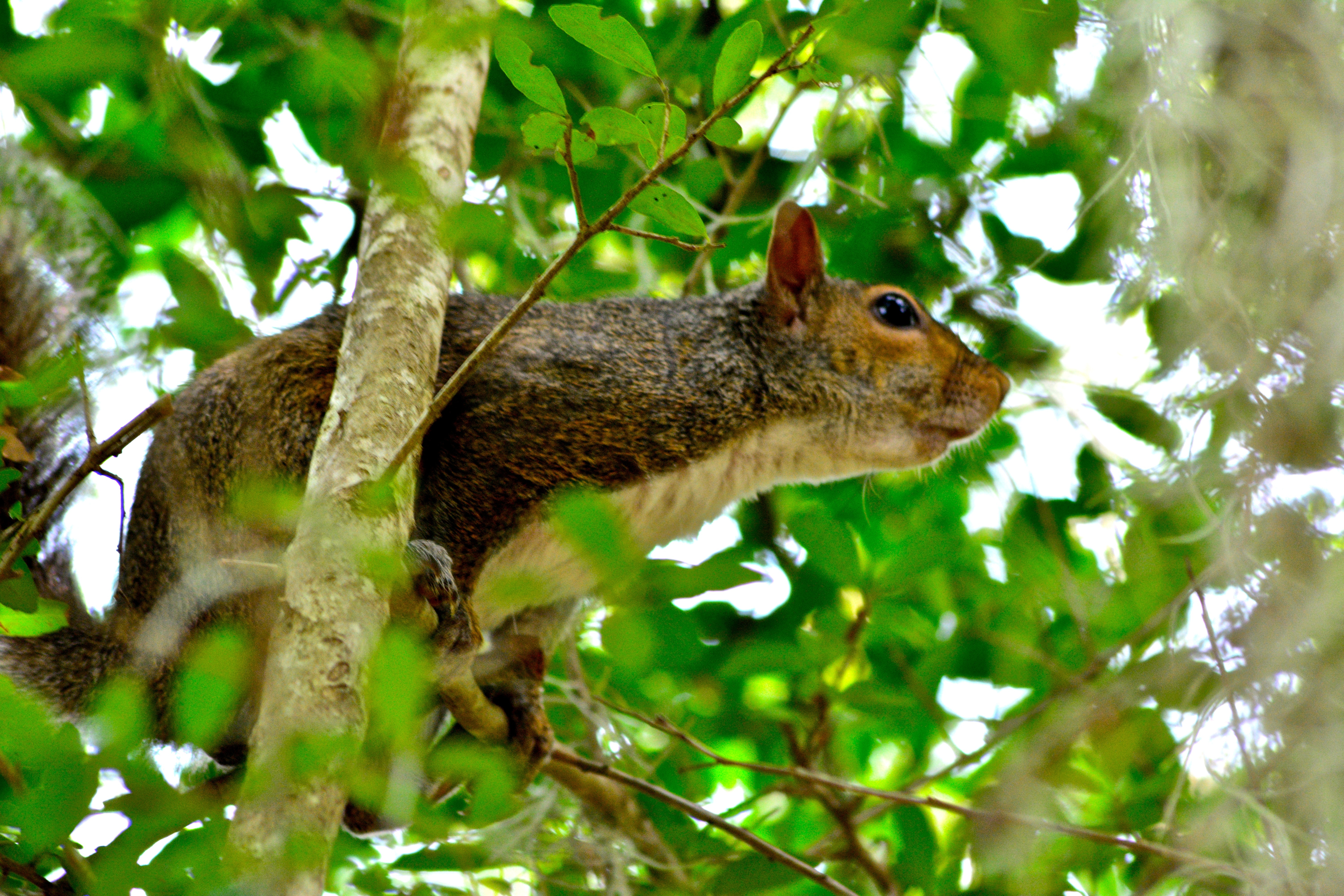 A busy squirrel at Our Lady of Mepkin Abbey nearish to Moncks Corner, S.C. It’s a Trappist monastery on a Cooper River estate donated by Henry R. and Clare Booth Luce. Taken on July 21, 2014. Nikon D5200. Sigma 70-300mm F4-5.6. f/8. 1/90th sec. 240mm (DX360mm). ISO 800. 0EV. Click on image to enlarge.