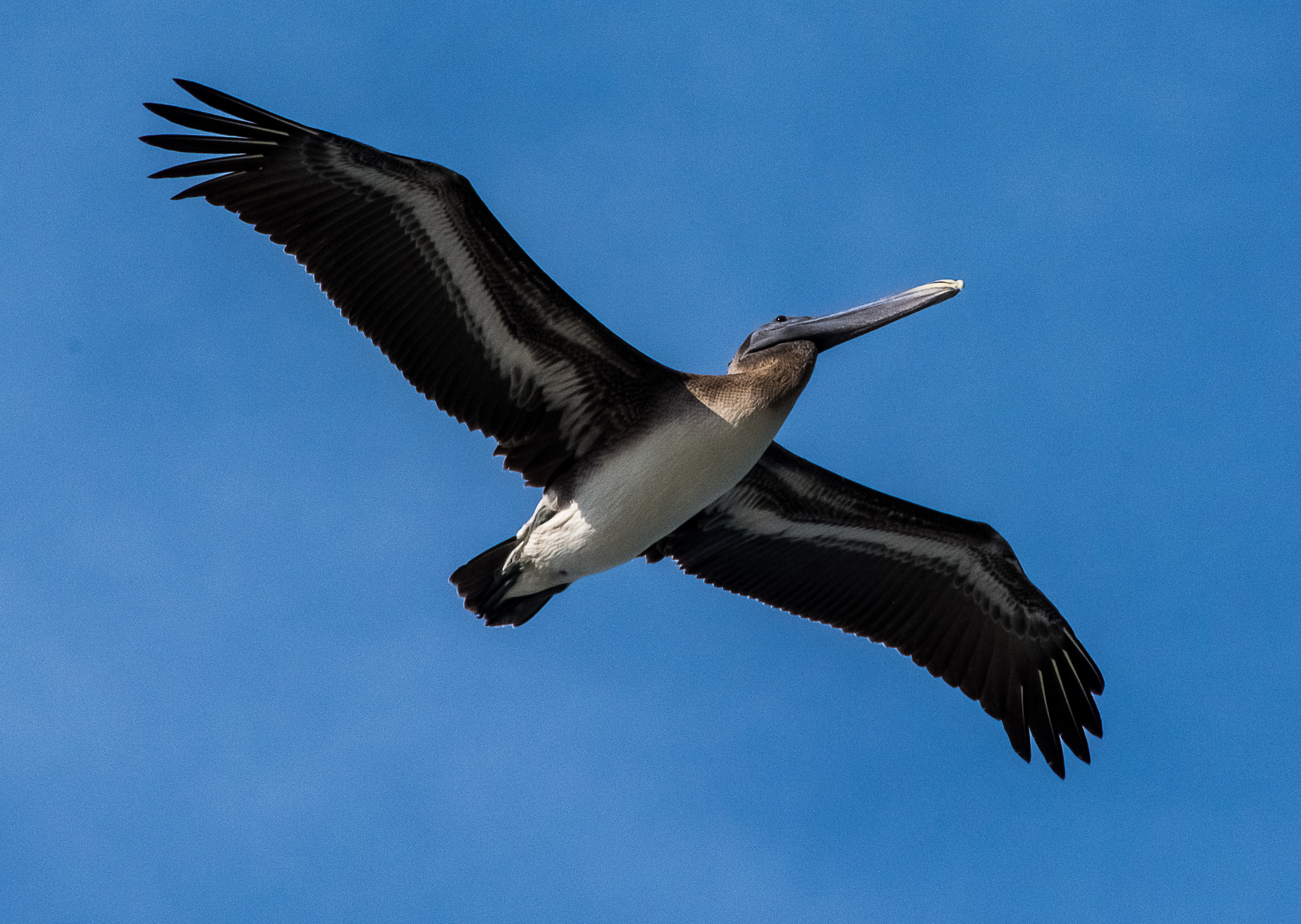 Brown pelican above Crescent Beach, Fla. Taken on October 21, 2014. Nikon D5200. Tamron 70.0-300.0 mm f/4.0-5.6. ISO 800. f/19. 300mm (DX450mm). 1/750th sec. Click on image to enlarge.