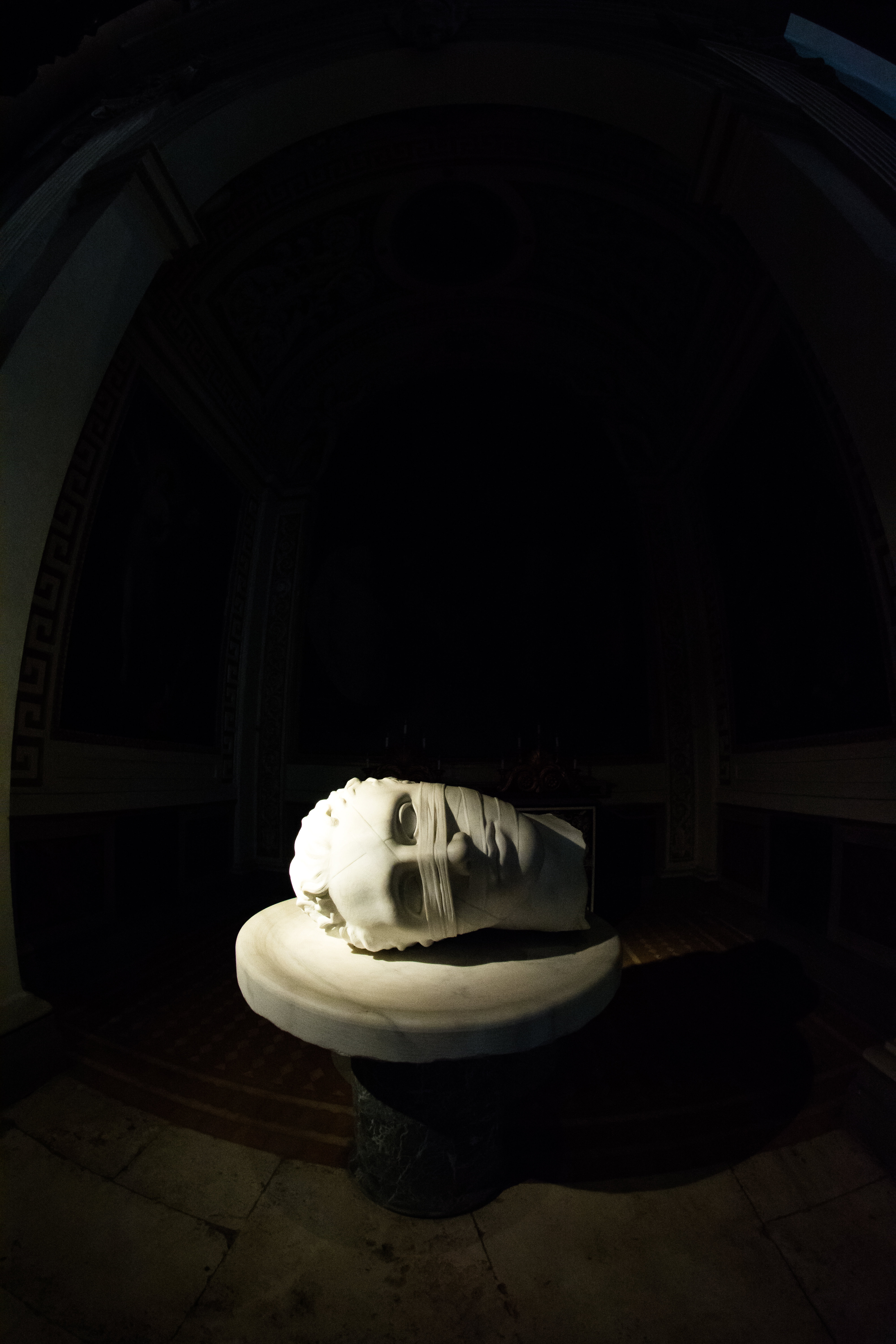 2015.10.07.4611 John the BaptistJohn the Baptist, by Polish painter and sculptor Igor Mitoraj (b.1946), of Carrara marble in 2006. It’s at the Basilica of Sta. Maria Degli Angeli e dei Martiri at the Piazza della Repubblica in Rome, Italy. Taken Oct. 7, 2015. Nikon D7100. Rokinon 8mm f/3.5 fisheye. 1/80th sec. F/3.5. 8mm (DX 12mm). ISO 1600. RAW. The bust is more serene than other post mortem depictions of the Baptist that I can recall, as if he’s saying, “Mission accomplished.” The church now is a memorial to Italian war dead. It was Michelangelo’s last big architectural feat, carved from the ruins of the frigidarium (cold baths) of the ancient Roman Baths of Diocletian. A quiet, lovely, untouristed gem. Click on image to enlarge.