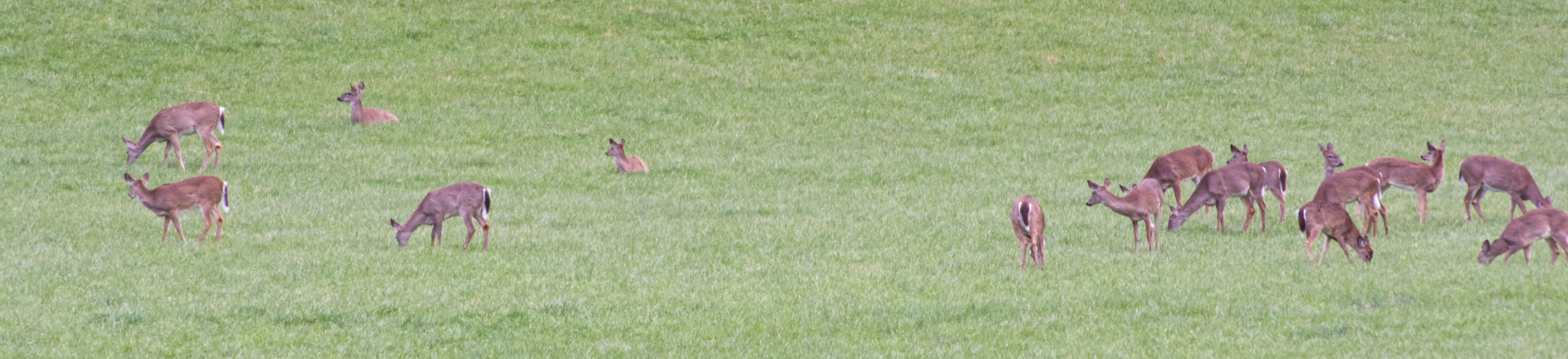 Deer flock to a nearby hay pasture after sunset to feed. Taken on April 10, 2015. This is a typical evening gathering in springtime, and sometimes the herd is bigger. Nikon D7100. AF Nikkor 70-210mm f/4-5.6. f/8. 1/60th sec. 210mm (DX315mm). ISO 800. 0EV. Click on image to enlarge.