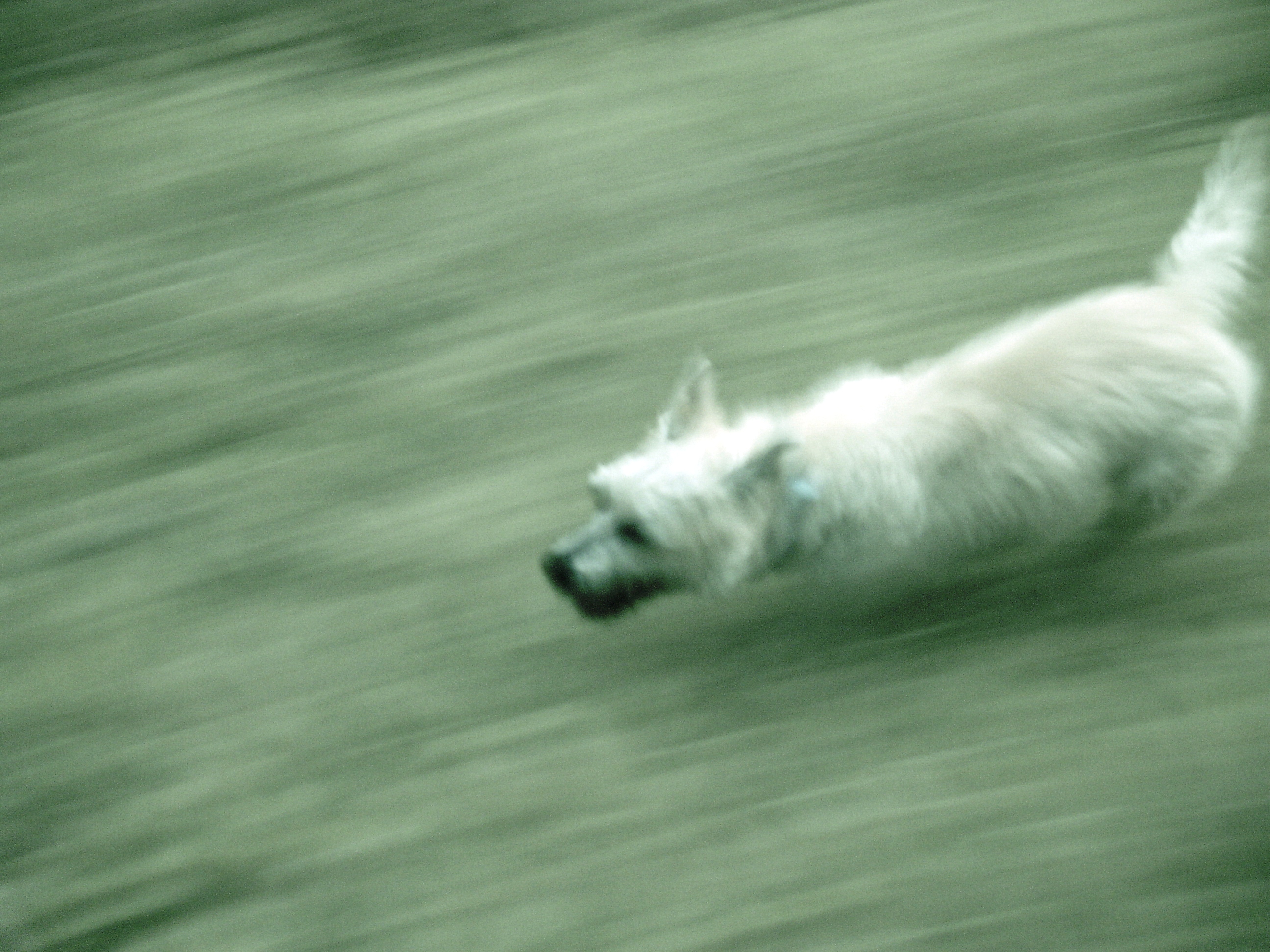 Cairn on the run: Blossom charges down our road after a car. Age 9 months. Photo taken July 27, 2005. Sony DSC-V3. TIFF. f/4.0. 28mm 1/15th sec. ISO 800. Click on photo to enlarge.