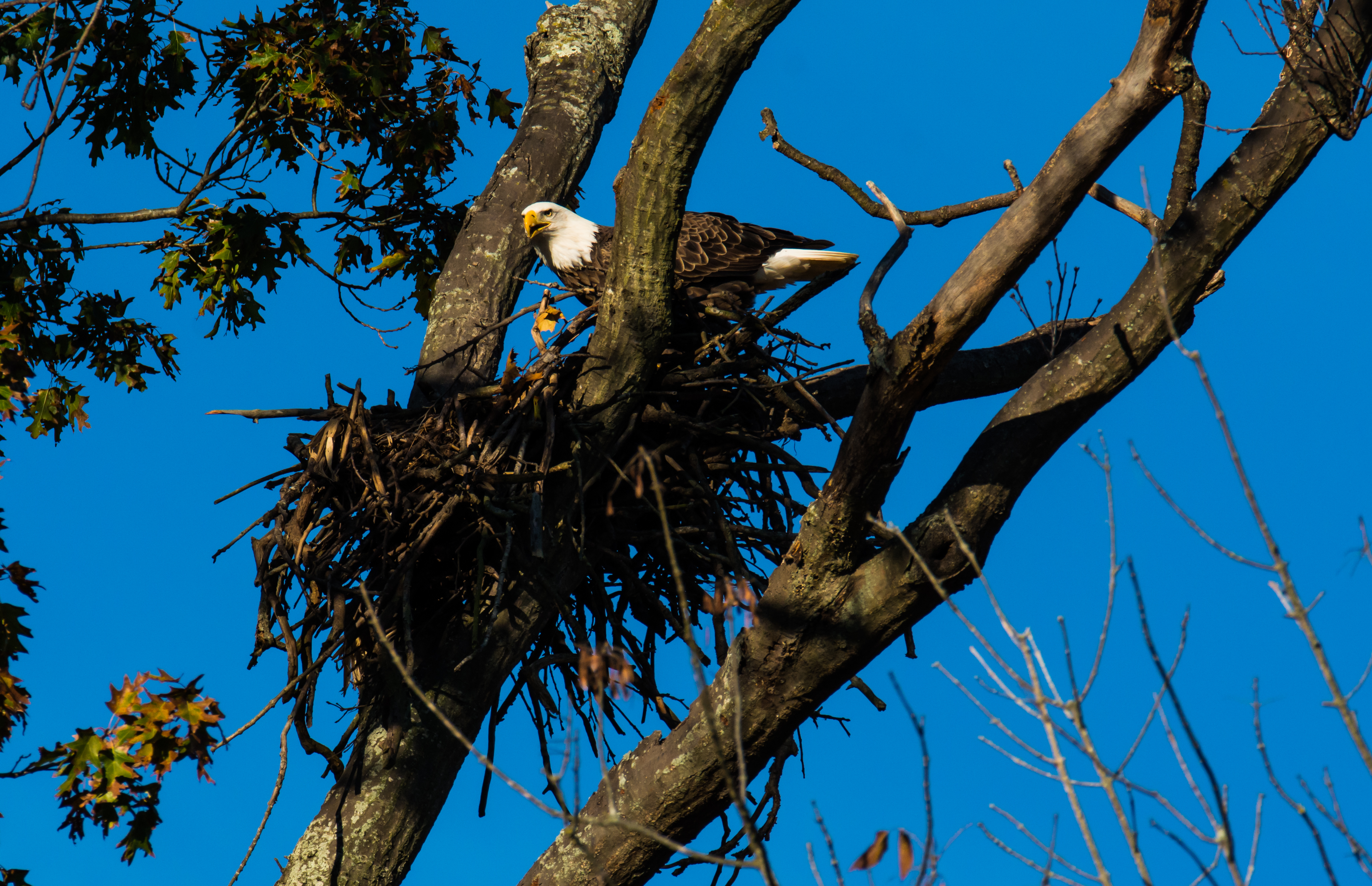 A bald eagle on its nest beside the James River south of Richmond, Va. Nikon D7100. Tamron 200-600mm F/5.6-6.3. RAW. ISO 400. f/10. 1/1600th sec. 460mm (DX 690mm). -0.7EV. Click on image to enlarge.