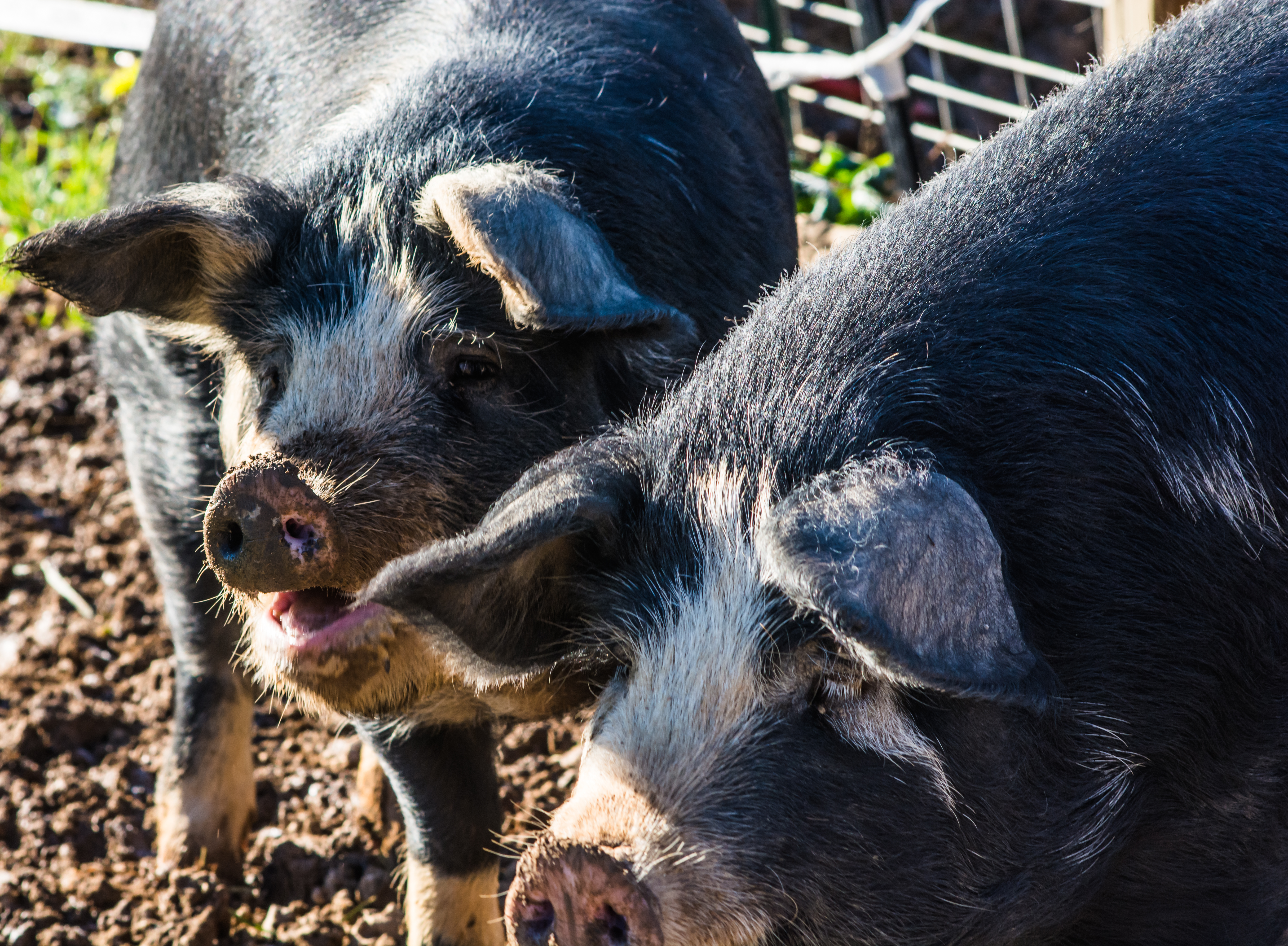 On a cold, frosty morning in Catawba, Va., the perfect weather for killing hogs, this porcine pair cluelessly enjoys a last cup of grain before being dispatched — the one the left for me and another gentleman to split; the one on the right for the folks who raised them. Picture, and hogs, shot Dec. 5, 2015, at St. Gall Farm. Nikon D7100. Sigma 70.0-300.0 mm f/4.0-5.6. RAW. 1/250 sec; f/8; ISO 360. 110mm (DX 165mm).