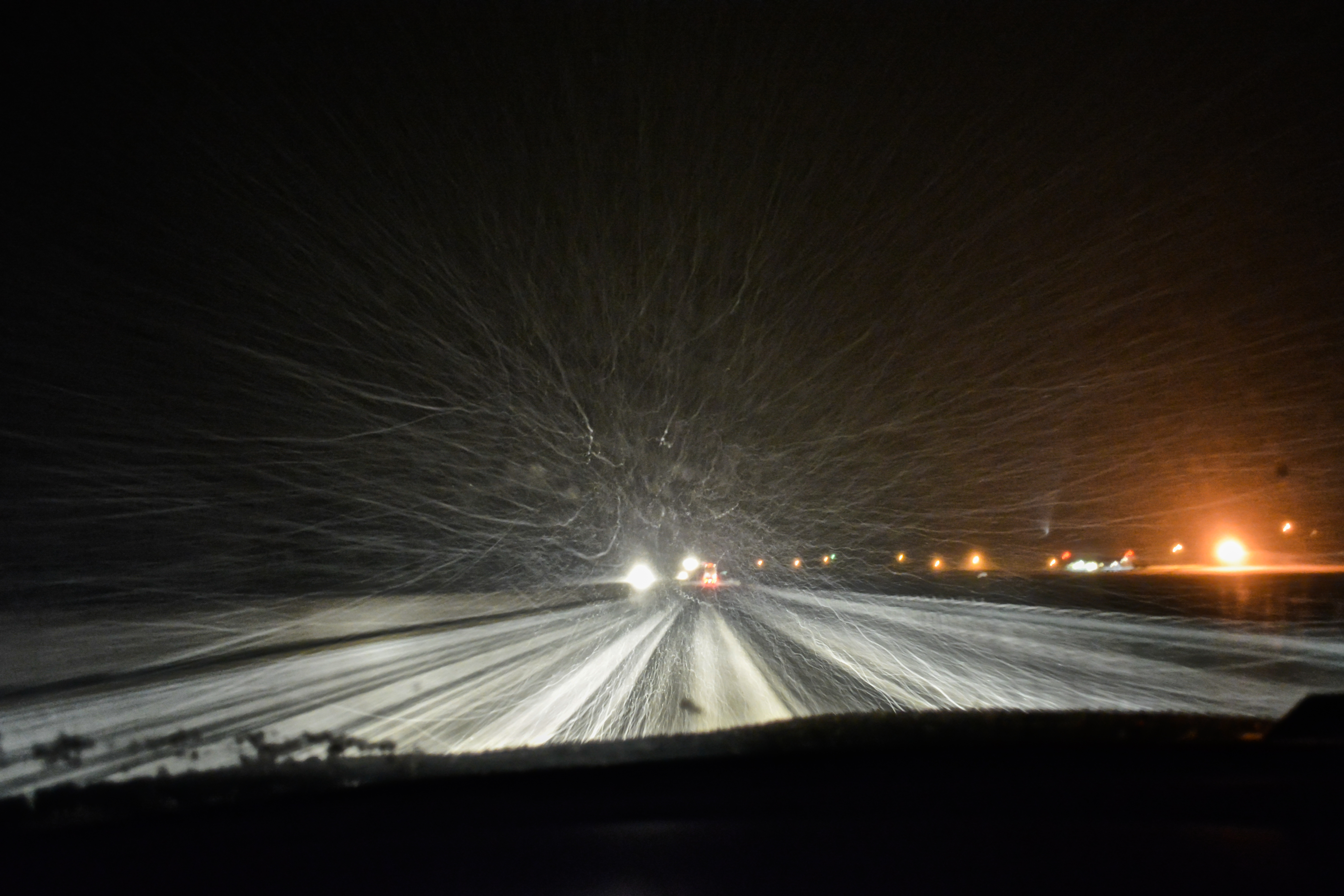 Snow makes the going dicey heading north toward home on Interstate 81 in Smyth Co., Va. Taken on January 2, 2014. Nikon D5200. AF-S DX VR Zoom-Nikkor 18-55mm f/3.5-5.6G. ƒ/3.5. 18.0 mm (DX 27mm). 0.5 sec. ISO 3200. Click on image to enlarge.