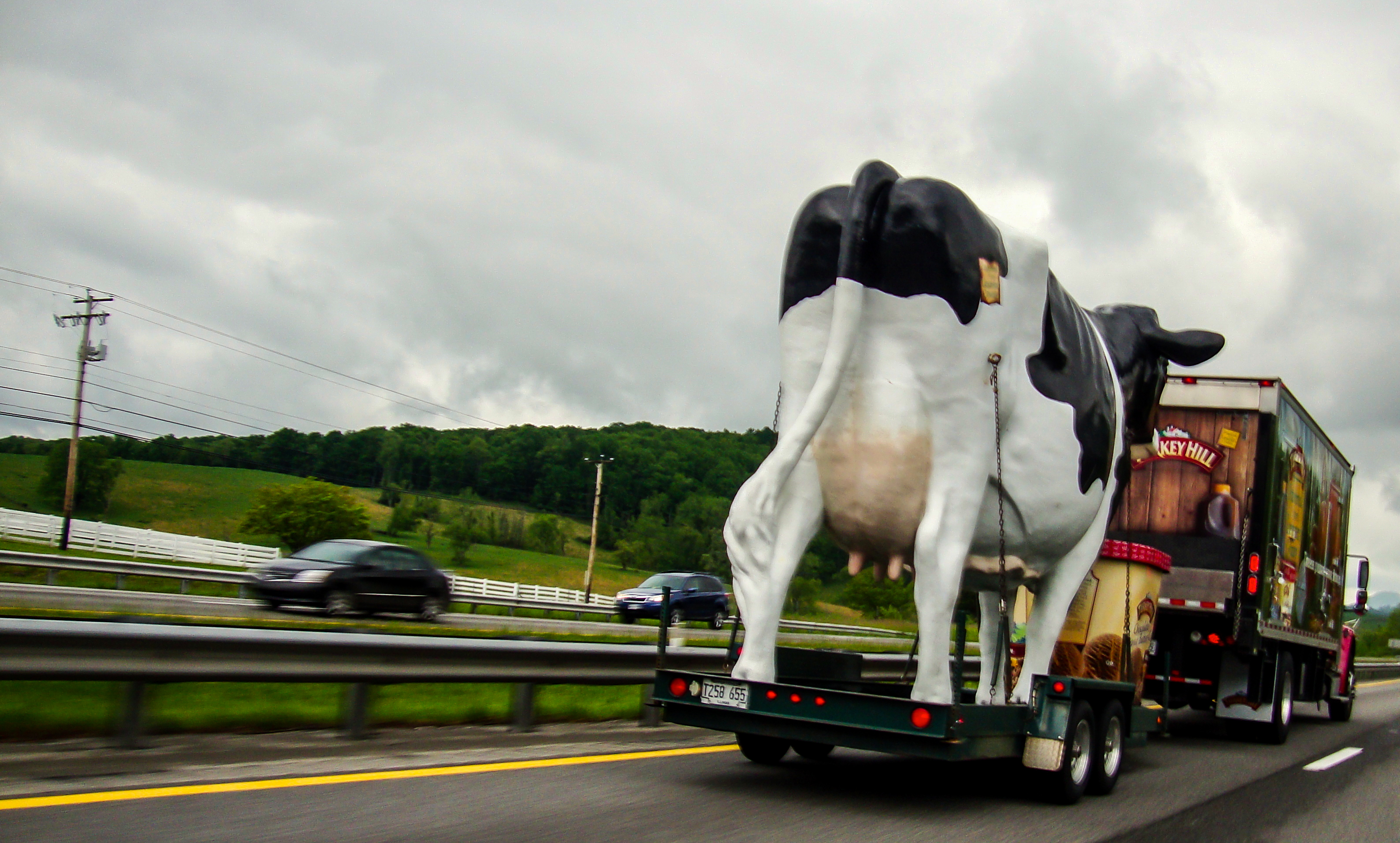 A very large cow (promoting Turkey Hill ice cream) passes my car on Interstate 81 going south on May 19, 2013. Sony DSC-W220. 5.4 mm. 1/125 sec, f/7.1. ISO 100. Click on image to enlarge