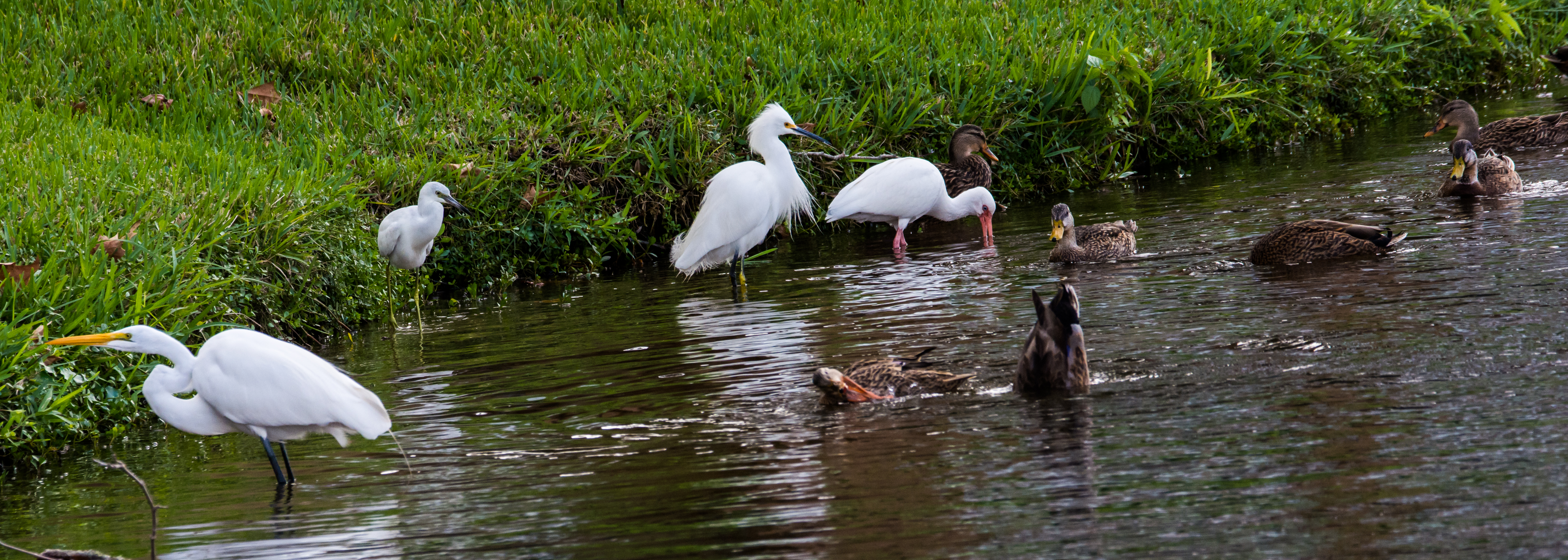 How many can you identify? Several varieties of shore birds and paddlers convene in a shallow spot at Fleet Landing’s pond in Atlantic Beach, Fla. Not an “artistic” shot, but of interest for its diversity. The birds are (from left) great egret, juvenile little blue heron, snowy egret, white ibis and mottled ducks. Picture taken Jan. 5, 2016. Nikon D7100. Tamron 150.0-600.0 mm f/5.0-6.3. RAW. 1/500 sec; f/9; ISO 800. 380mm (DX 570mm). Click on image to enlarge.